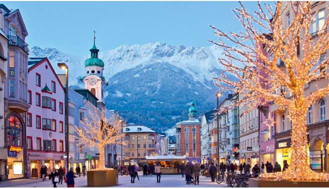 因斯布鲁克Innsbruck位于奥地利西南腹地,是奥地利第五大城市,也是著名的滑雪胜地,冬季奥林匹克运动会曾于1964年和1976年两次在此举办。因斯布鲁克至今仍保持着中世纪城市的面貌,在狭窄的小街上,哥特风格的楼房鳞次栉比。而且这里最独特迷人的景色是坐落在冰川山谷中的中世纪建筑。