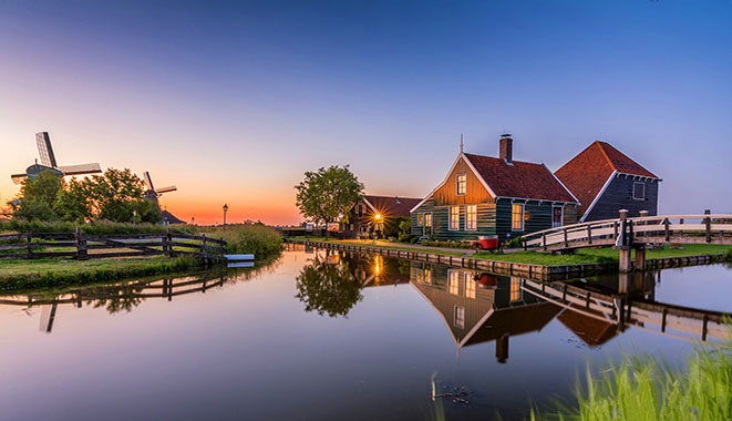想去荷兰看风车吗?最理想的去处之一就是桑斯安斯。桑斯安斯(Zaanse Schans)是荷兰西北的北荷兰省的一个小村,有"荷兰风车博物馆"之称,收罗保存完好的荷兰古式风车和房屋,是荷兰一个著名的旅游景点。桑斯安斯一般人会直接简单叫风车村。桑斯安斯对于很多游客来讲就是一个开放式的博物馆。这里可以看到荷兰人如何利用风车产生动力,研磨制造材料的木材。进入这个区域并不收门票,不过有些开放参观的风车的博物馆是酌情收入场费。这里还有各式各样的小博物馆,例如乳酪工厂、类似手工艺品、木鞋工厂等,相当有趣。