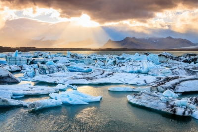 瓦特纳冰川上的巨冰不断崩塌融化变成碎冰流到杰古沙龙冰湖,被大西洋的海水冲到杰古沙龙冰湖对面的黑色沙滩上。这些碎冰石有一定的透明度,在阳光的照耀下,冰块熠熠生辉,与黑色的沙滩形成鲜明对比,就像一块块闪耀的钻石。故被称为钻石沙滩。